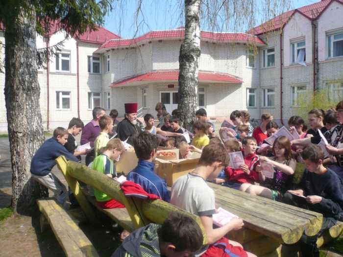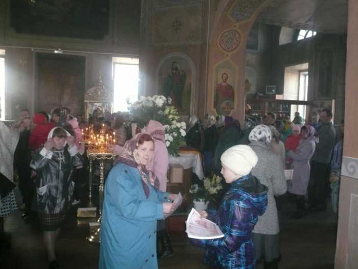 Листовки раздавали также жителям с. Луговец, которые пришли к храму во имя Святителя Николая для освящения Пасхальной снеди и воспитанникам и работникам Мглинской спецшколы-интерната.