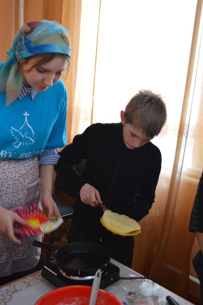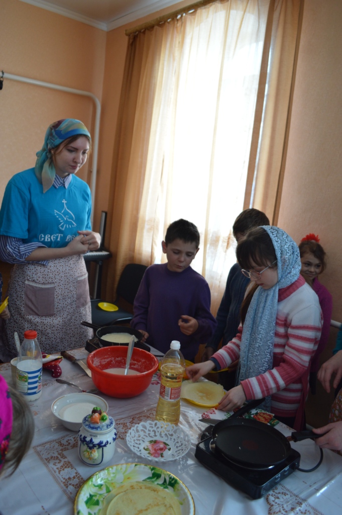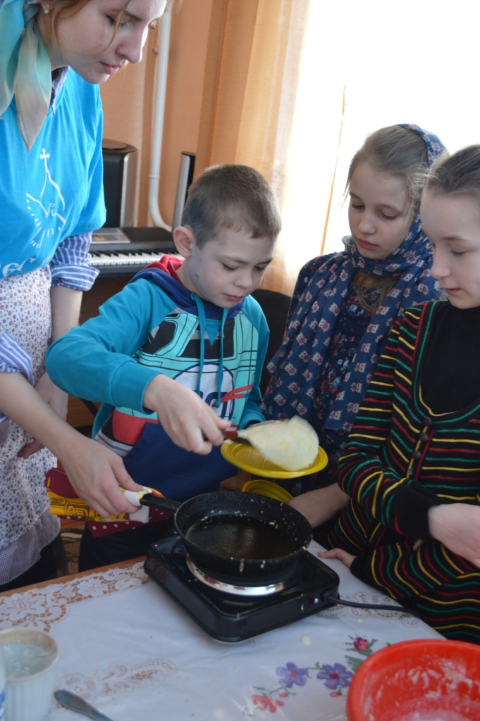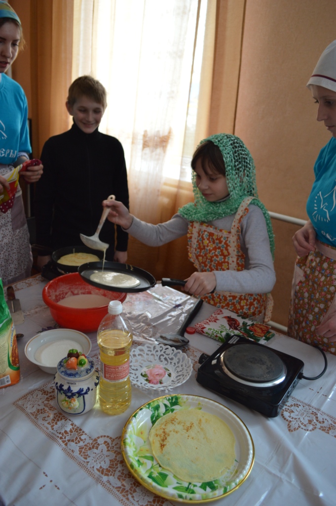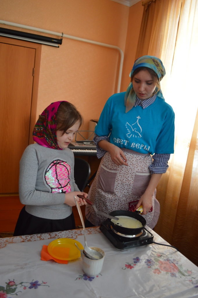 В воскресный день 3 марта для воспитанников воскресной школы храма Успения Пресвятой Богородицы г. Мглина состоялось необычное занятие. В преддверии приближающейся масленицы студентки выпускных курсов Мглинского филиала ГБПОУ «Брянский аграрный техникум имени Героя России А.С. Зайцева» Анастасия Гулакова и Мария Власенко, являющиеся представителями молодежной православной группы Мглинского благочиния «Свет веры» провели для ребят мастер-класс по выпеканию блинов.