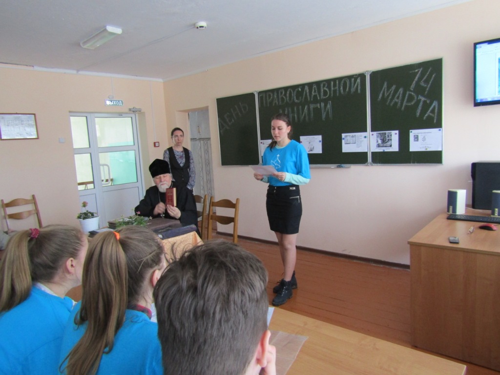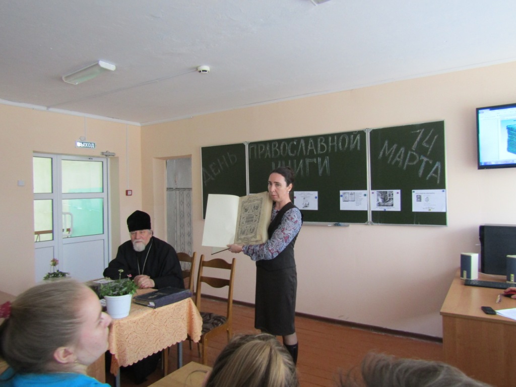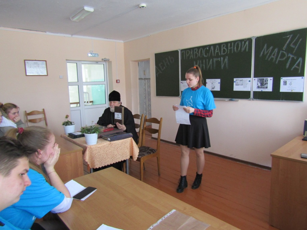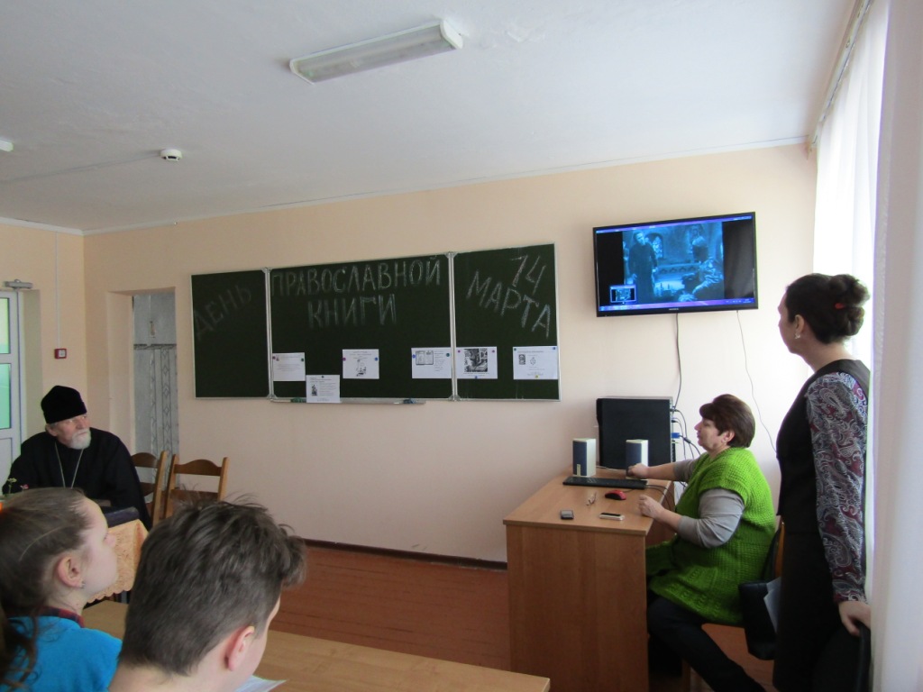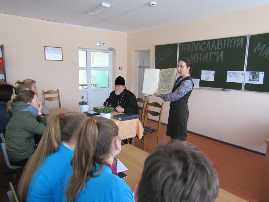 Помощник благочинного по работе с молодежью Светлана Александровна Рыжакова рассказала о роли православной книги, истории праздника, приуроченного к дате выпуска первой на Руси печатной книги диакона Ивана Фёдорова «Апостол», изданной 14 марта 1564 года, напомнила о книге, являющейся живой связью времен и поколений наших благочестивых предков. О том, как от рукописных книг пришли к печатным, трудах первопечатников Ивана Фёдорова и Петра Мстиславца было рассказано особенно подробно. Вниманию участников мероприятия был представлен видеофильм о Иване Федорове.