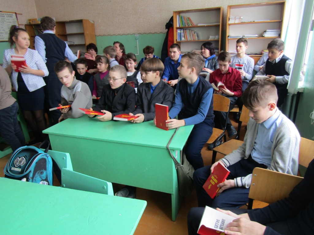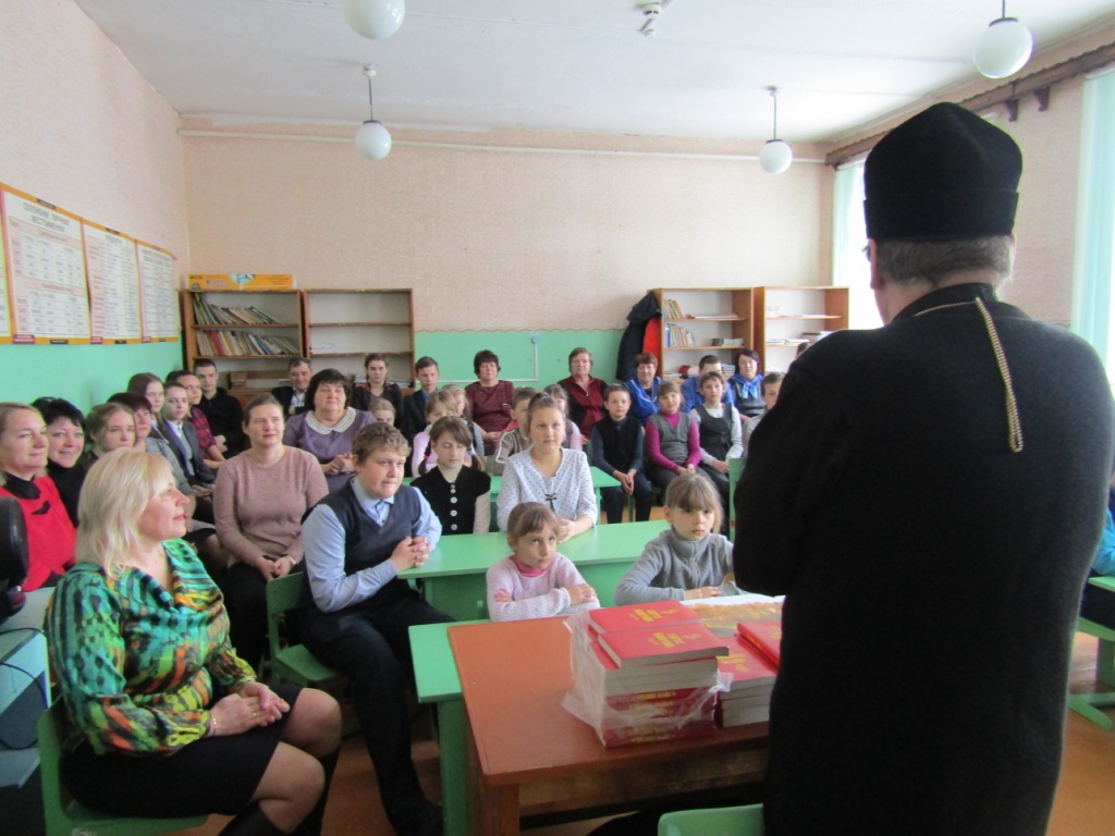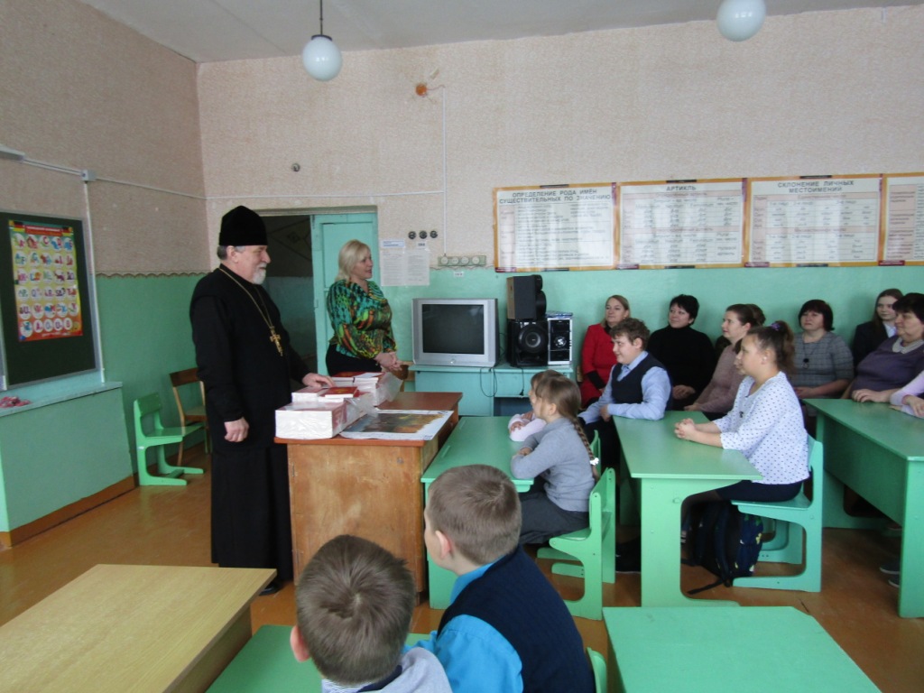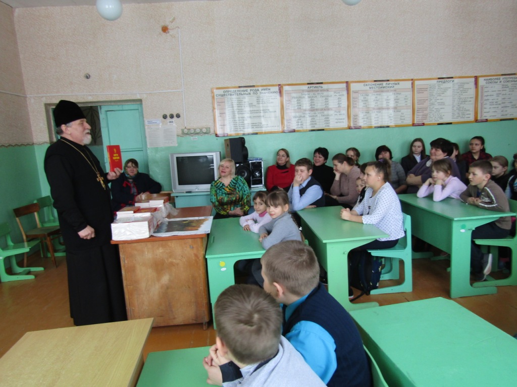 В завершении визита протоиерей Василий пожелал и педагогическому коллективу, и учащимся школы благословенной помощи Божией в преподавании и учении, просветиться светом Христовой истины, достойно звания христианина следовать путем Великого поста и преподнес в дар каждому Святое Евангелие, рассказав о том, как важна эта Книга для христиан, что каждый дом должен быть согрет ее святыми словами и всеобщим чтением.