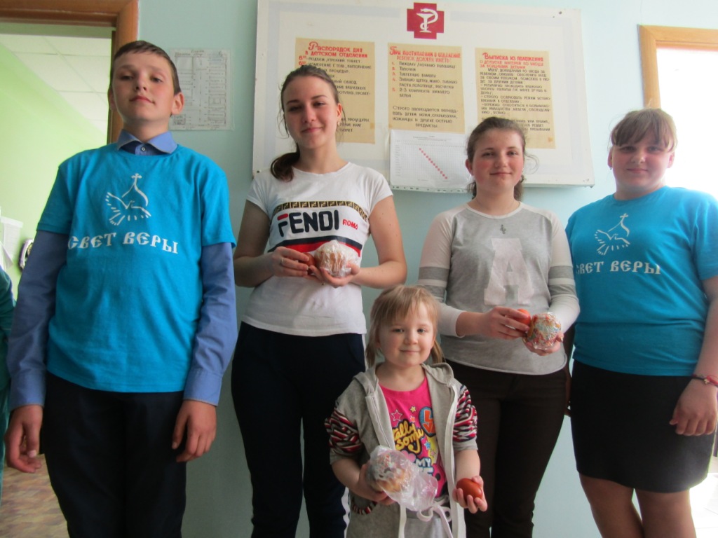 Ребята поделились с каждым пациентом и медицинским персоналом лечебницы лучезарной вестью о Воскресшем Спасителе, кратко рассказав о евангельских событиях сего великого празднества и его значении для всего человечества, православных символах сего торжества и христианской традиции его празднования. С поздравлениями с праздником Святой Пасхи и пожеланиями помощи Божией в излечении от недугов и скорейшего выздоровления, юные христиане преподнесли в дар болящим и медицинскому персоналу пасхальные дары: кулич и крашеное яйцо. Также каждому пациенту и сотруднику медицинского учреждения были подарены пасхальные листовки, дабы каждый мог познакомиться с истинным значением, символами и молитвословиями праздника праздников – Пасхи Христовой.