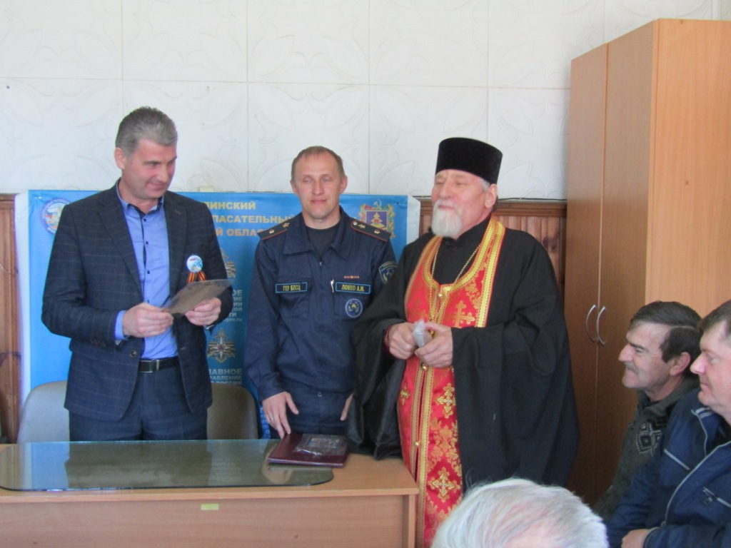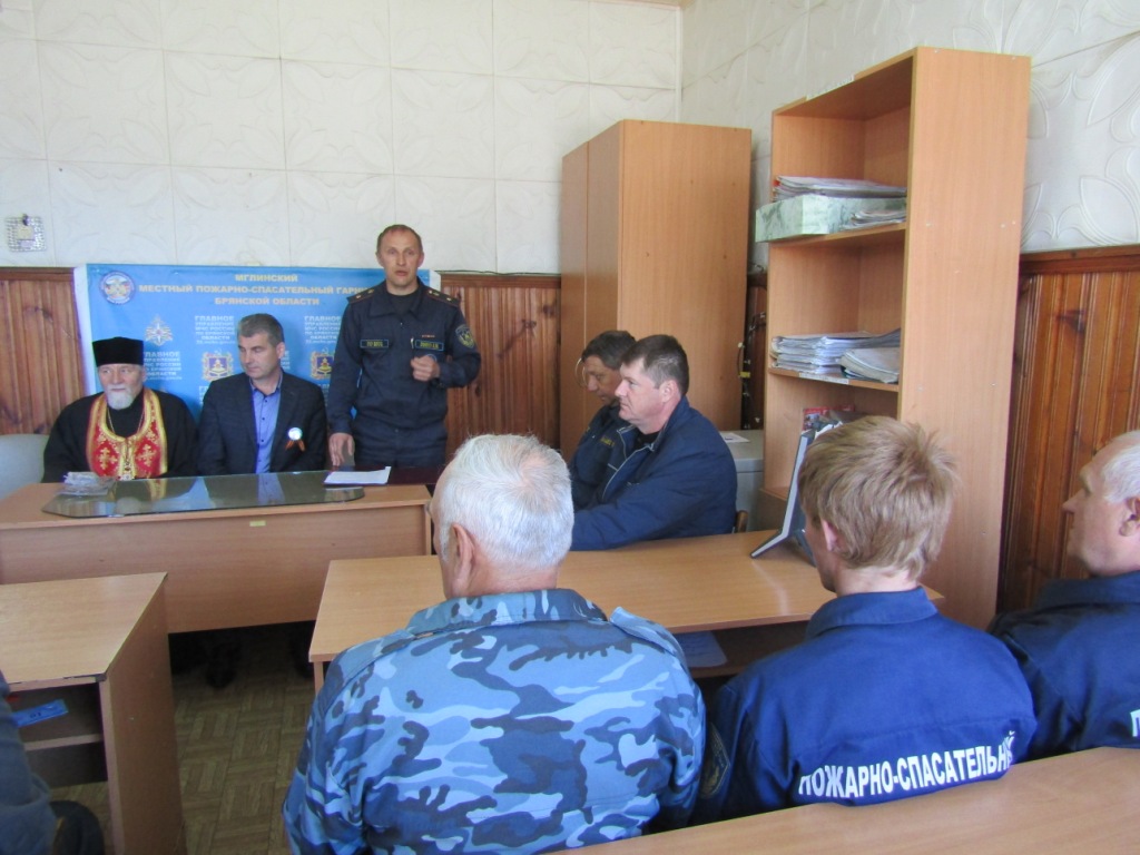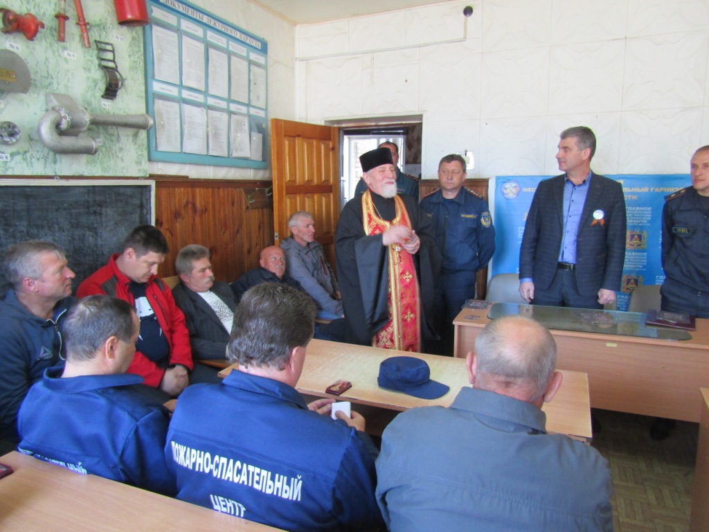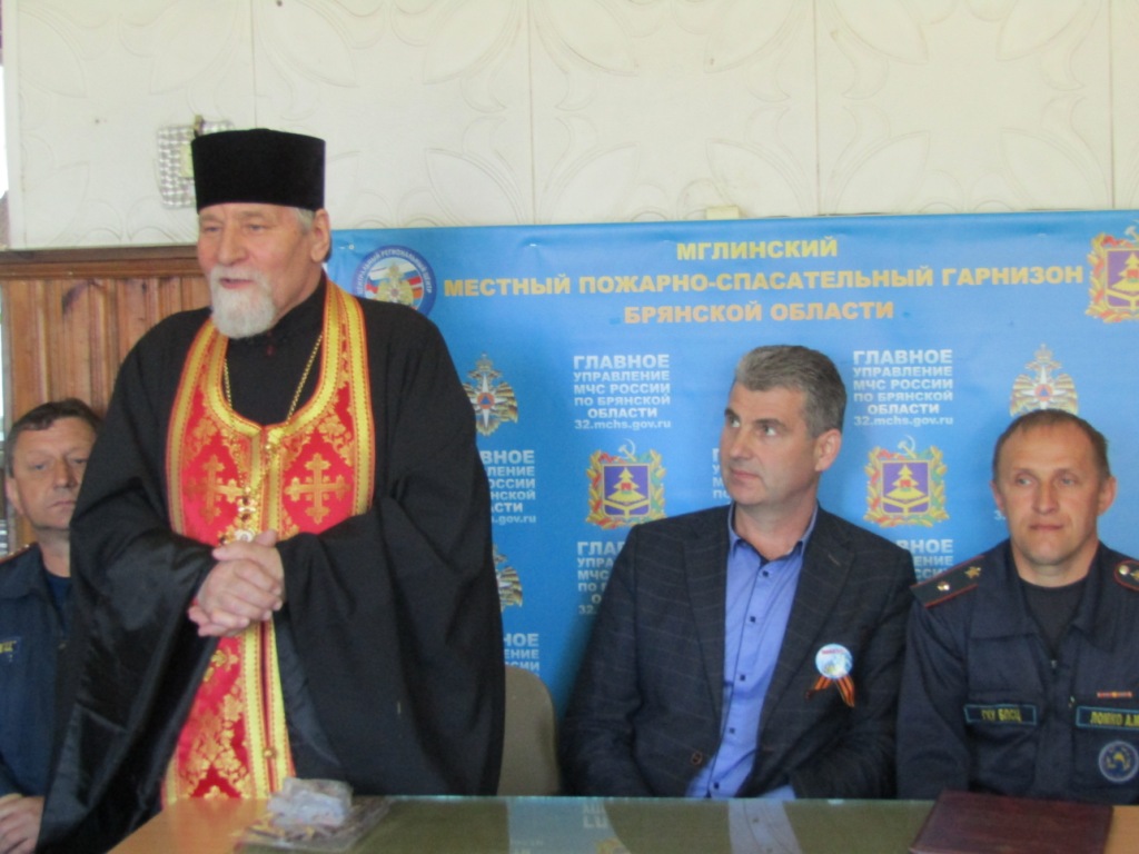 Поздравления с профессиональным торжеством от благочинного Мглинского церковного округа протоиерея Василия Климчука принимал и личный состав структурного подразделения Брянского пожарно – спасательного Центра ПЧ-45 по охране г. Мглина. Его Высокопреподобие отслужил молебен, за которым молились все сотрудники во главе с начальником Александром Михайловичем Ломко и заместителем Главы администрации Мглинского района Казеко Александром Николаевичем. По завершении богослужения священнослужитель поздравил личный состав и ветеранов службы с профессиональным праздником, поблагодарил за спасение человеческих жизней, призвал благословение Господне в несении важной службы помощи ближнему в чрезвычайных ситуациях и пожелал помощи Божией на их многотрудном профессиональном поприще. По случаю профессионального праздника батюшка подарил пожарникам иконки Божией Матери «Неопалимая купина» - защитницы и покровительницы тех, чья служба связана с борьбой с огненной стихией.