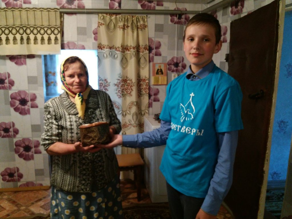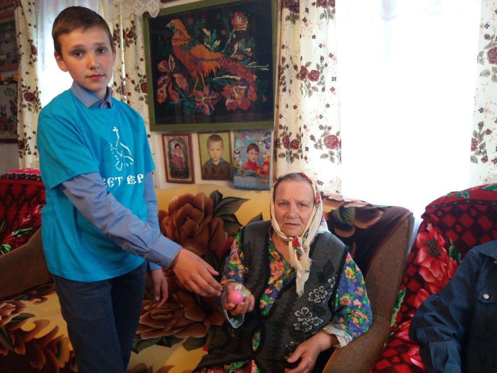 Душевное тепло радости пасхальной принесли старикам представители православной молодежной группы Мглинского благочиния «Свет веры» Пинчуков Александр и Лосева Екатерина. По благословению благочинного Мглинского округа протоиерея Василия Климчука, ребята посетили пожилых жителей своего села, поздравив стариков со светлым праздником Воскресения Христова и преподнеся им традиционные пасхальные дары: куличи и крашеные яйца. С радостью дарили юные христиане свое участие и тепло общения пожилым односельчанам, возвещая о Тридневно Воскресшем Спасителе мира, наполняя их сердца светом пасхальной радости.