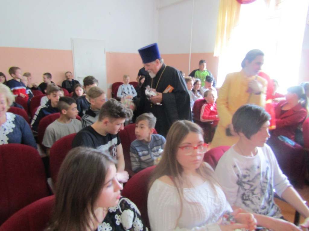 В завершении встречи под ликующее «Христос воскресе!» батюшка вручил детям школы-интерната сладкие праздничные подарки.