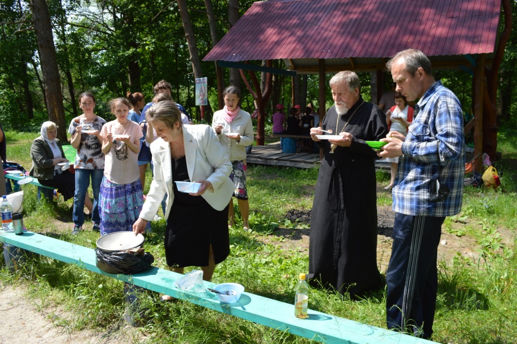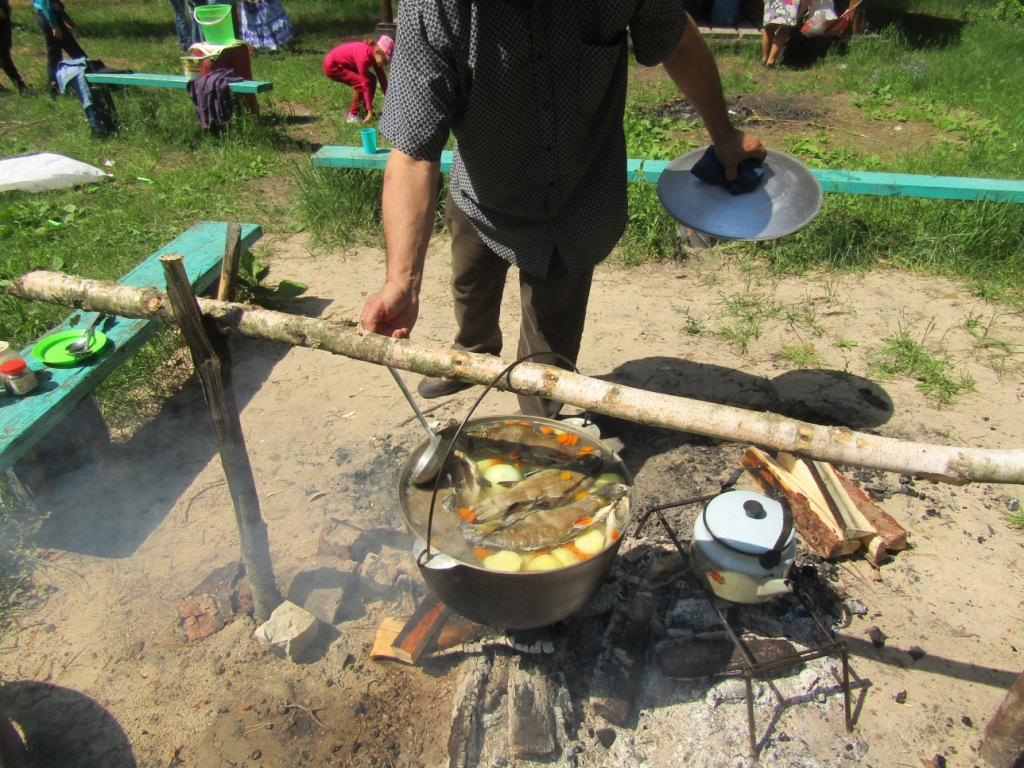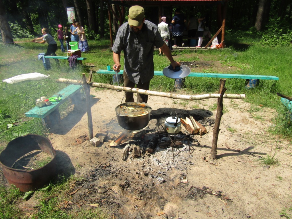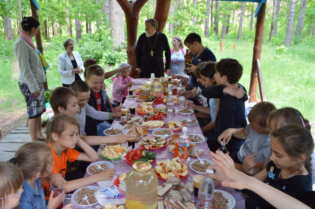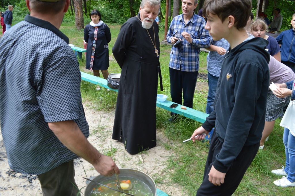 Насыщенная игровая программа, спортивные игры и состязания, в которых с нескрываемым удовольствием принимали участие и взрослые и дети, продолжилась общей трапезой. После того, как батюшка благословил трапезу, все собрались за общим столом. Обилие разнообразной еды увенчала ароматная уха, приготовленная на костре, которой с удовольствием отведали все. Ребята под руководством взрослых и сами постигали азы кулинарного мастерства, научаясь в походных условиях готовить еду на костре.