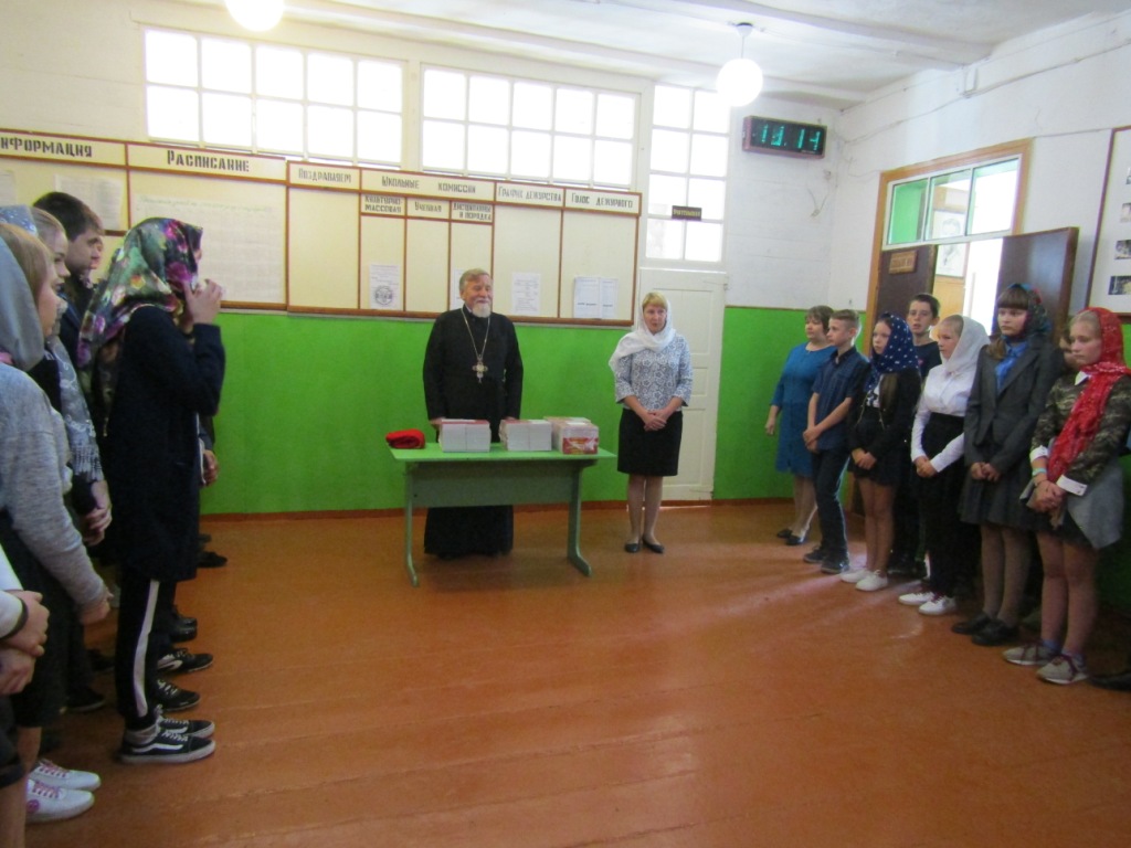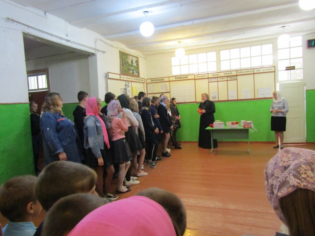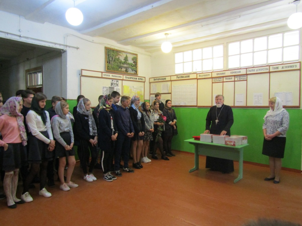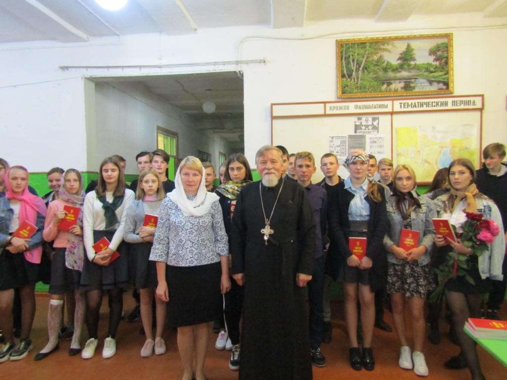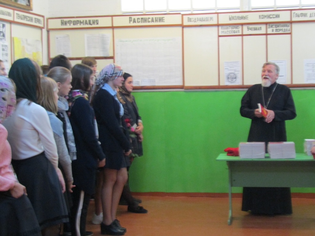 Протоиерей Василий призвал учащихся к активному, здоровому образу жизни, жизни по заповедям Господним в стремлении оградить себя от разрушительных страстей, погубляющих не только тело, но и душу. Батюшка рассказал присутствующим о Святом Евангелии – Книге книг, в которой содержатся Божественные истины, ведущие нас ко спасению. И оно само является источником жизни – словом, исполненным воистину силой и мудростью Господней. Учителя и учащиеся школы получили в дар от батюшки эту Главную Книгу человечества, дабы назидаться и утверждаться в жизни благодетельной – жизни во Христе.