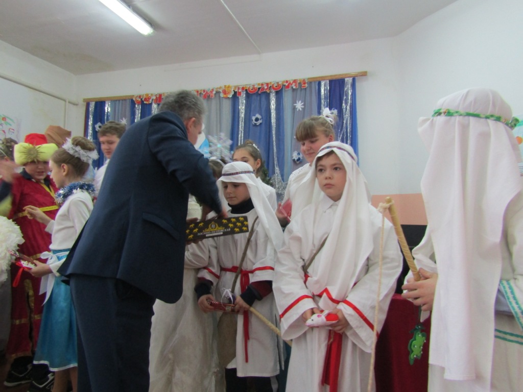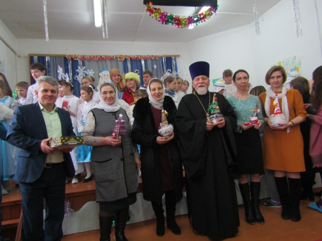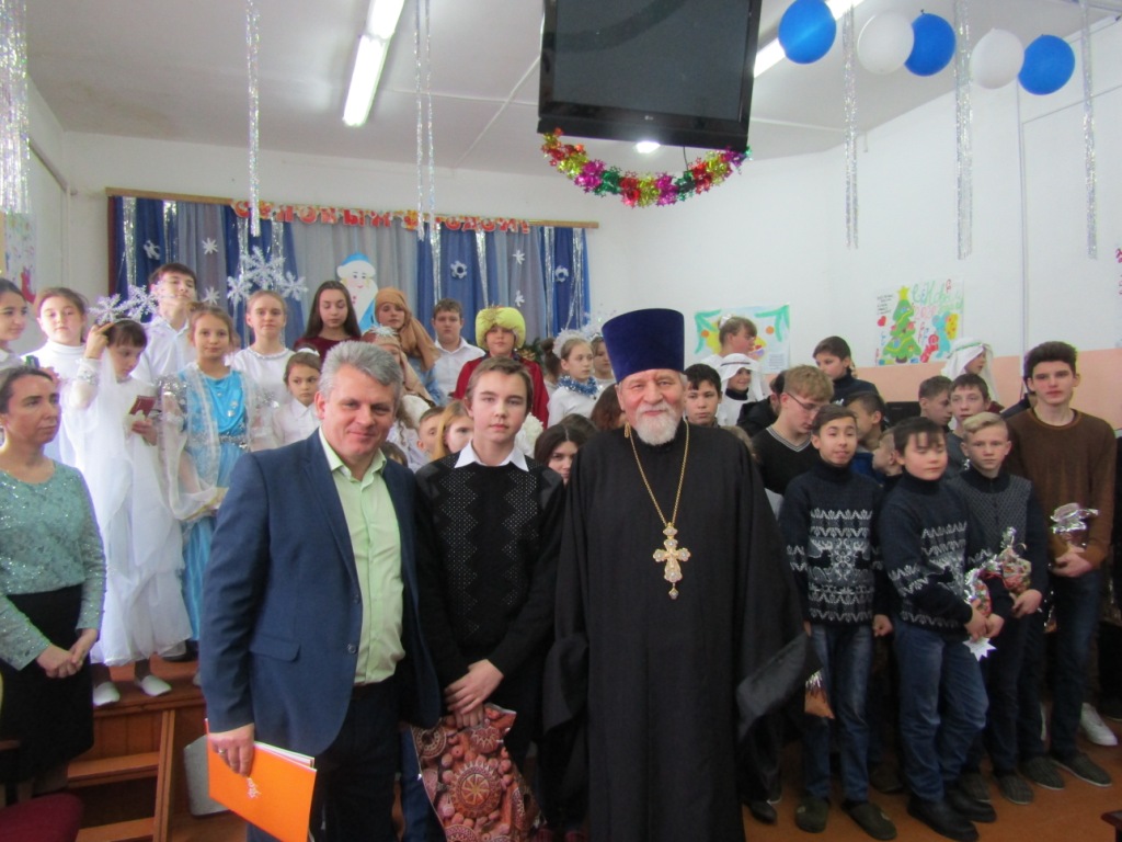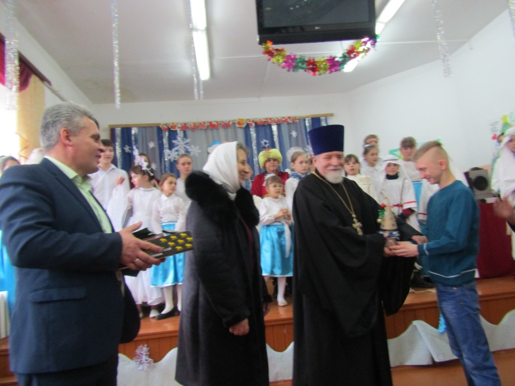 Директор школы-интерната Михаил Иванович Ходин, обратился с ответным словом к батюшке, адресовав ему и матушке Ольге Николаевне особые слова признательности и благодарности за многолетнее попечение и заботу о детях-сиротах. В знак любви и по случаю праздника ребята преподнесли батюшке и матушке, а также преподавателям воскресной школы рождественские подарки, сделанные своими руками. Также ребята школы-интерната подарили и учащимся воскресной школы сувениры, которые они изготовили сами, а М.И.Ходин вручил каждому шоколад.