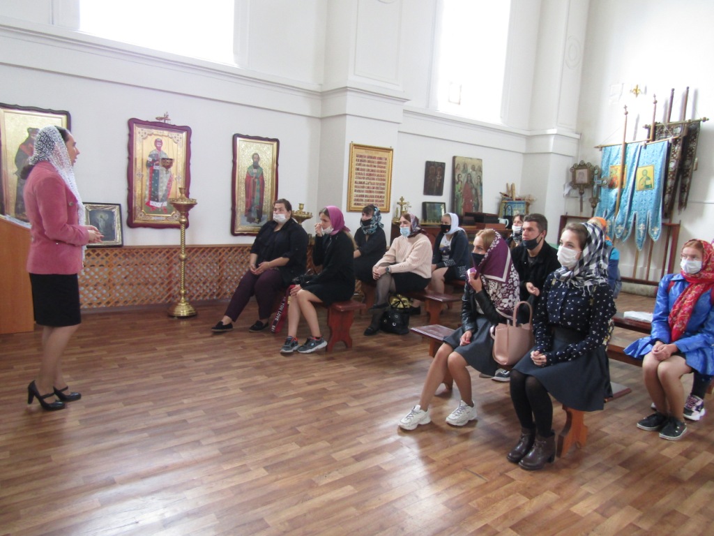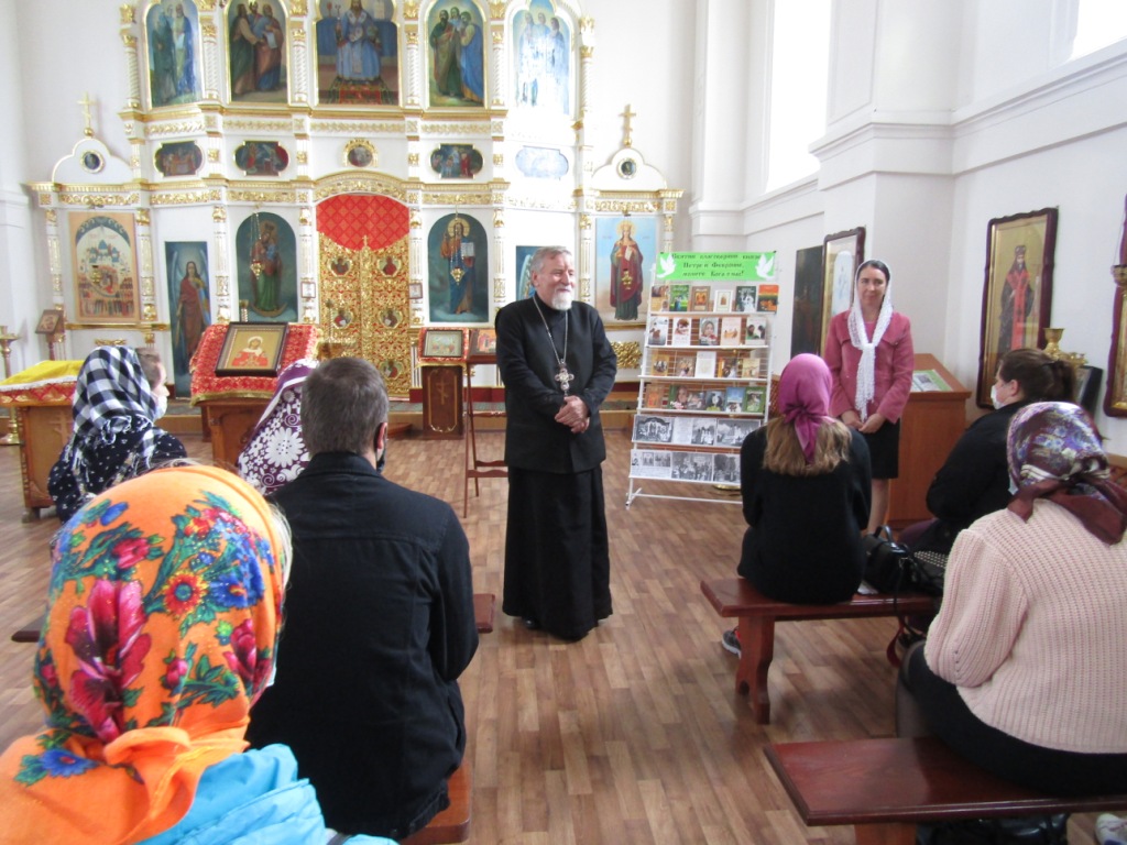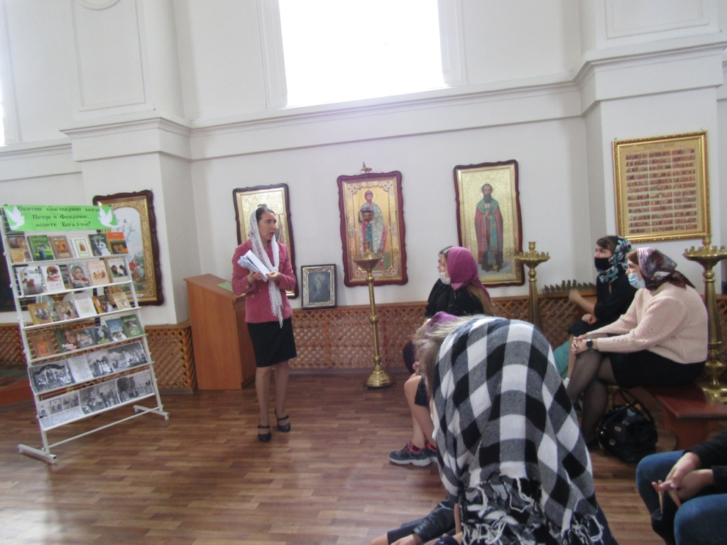 Помощник благочинного по работе с молодежью Светлана Александровна Рыжакова присоединилась к обращению батюшки и   рассказала  житие святых благоверных супругов, которые хранили верность друг другу до последнего дня, выдержав с помощью Божией все испытания, и разделив друг с другом все тяготы жизненного пути.  Они прожили долгую и трудную жизнь, твердо, целомудренно и праведно, не помышляя о расставании даже тогда, когда зависть и злоба людская обрушилась на их семью. По особой милости Господней они перешли в мир иной в одно и то же время. Их тела, положенные в разных местах, чудесным образом оказались во едином гробе и были погребены вместе, явив силу Евангельской Истины: «что Бог сочетал, того человек  да не разлучает»  (Мф. 19:5-6). Жизнь этих Небесных покровителей супружества служит примером должного отношения супругов к церковному браку и друг к другу. В ходе повествования Светлана Александровна ознакомила молодых людей с книжной выставкой, подготовленной приходским библиотекарем матушкой Ольгой Николаевной Климчук. На выставке были представлены книги о семье  и браке, воспитании детей,  христианских ценностях.