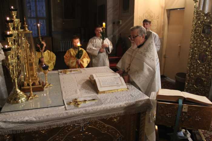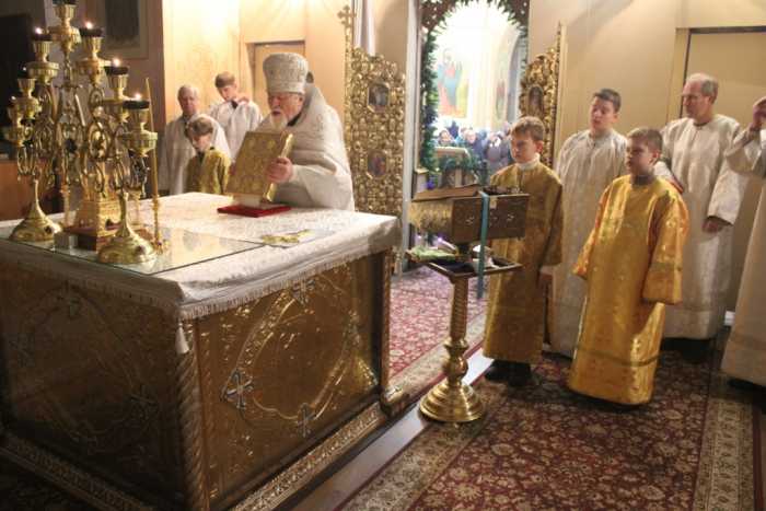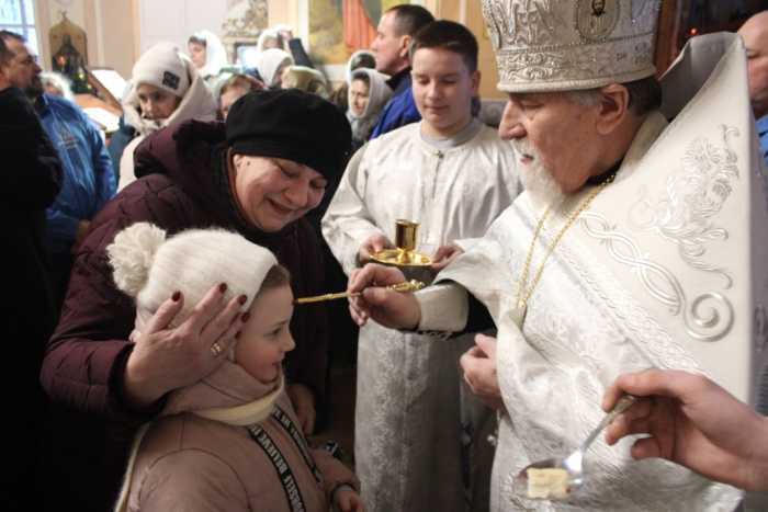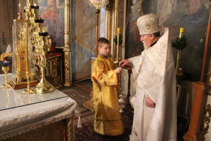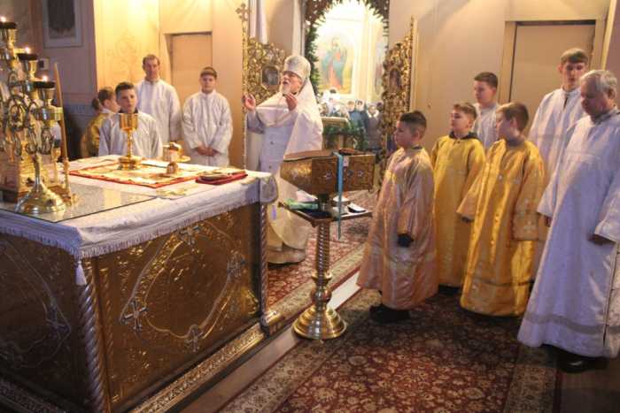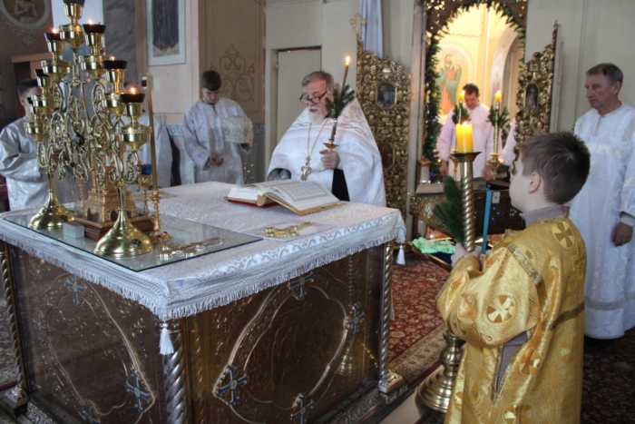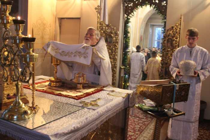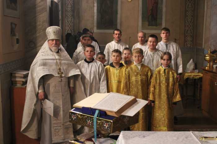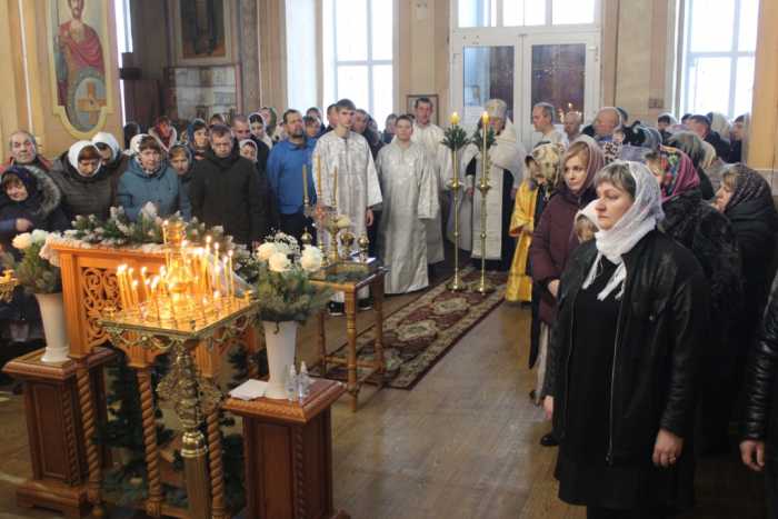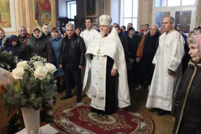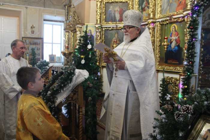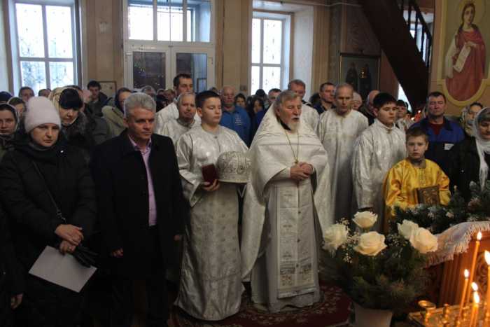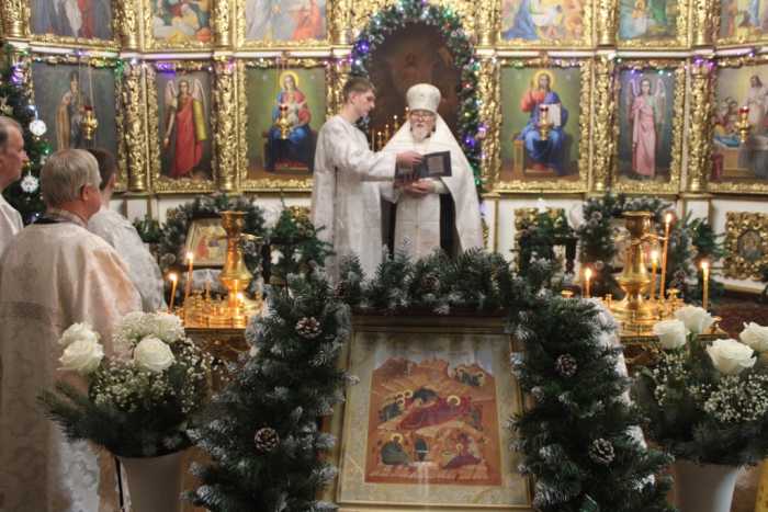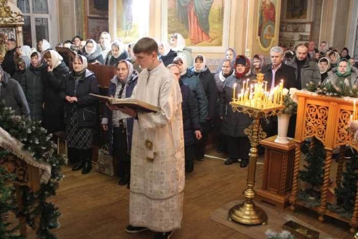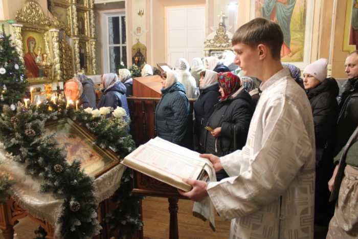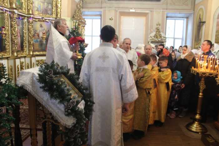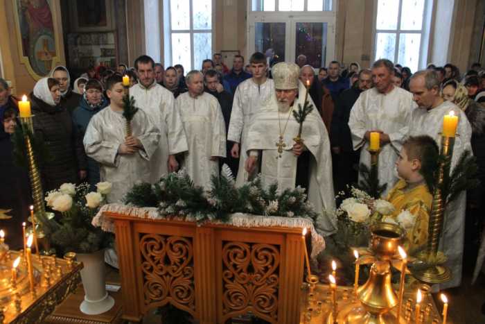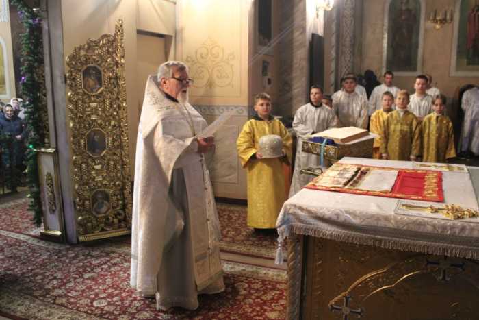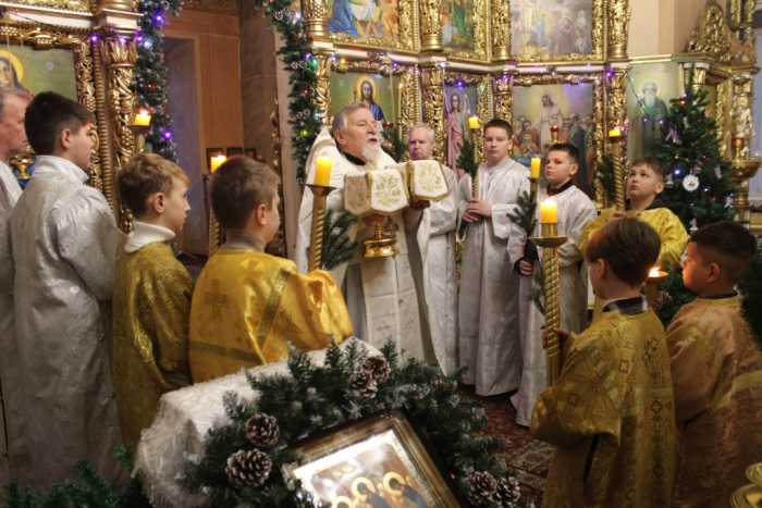 Особая по своей торжественности вечерняя служба началась с Великого повечерия с его прекрасным песнопением «С нами Бог…». После Великого повечерия настоятель храма совершил  литию с благословением хлебов, вина и елея. Во время праздничной утрени храм наполнился торжественными песнопениями, прославляющими грядущее торжество. В заключительной части богослужения верующие при поклонении иконе Рождества Христова были помазаны освященным елеем. По заверении всенощного бдения протоиерей Василий Климчук зачитал Рождественское послание Патриарха Московского и всея Руси Кирилла.