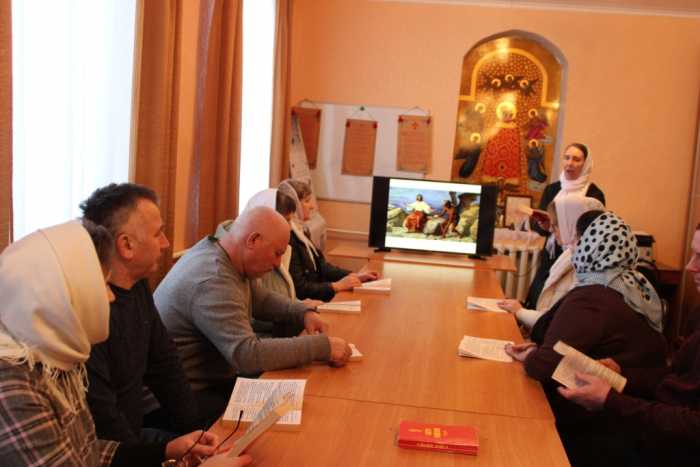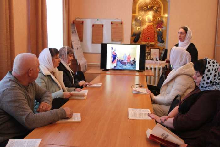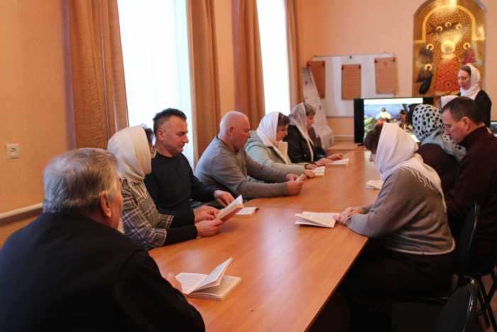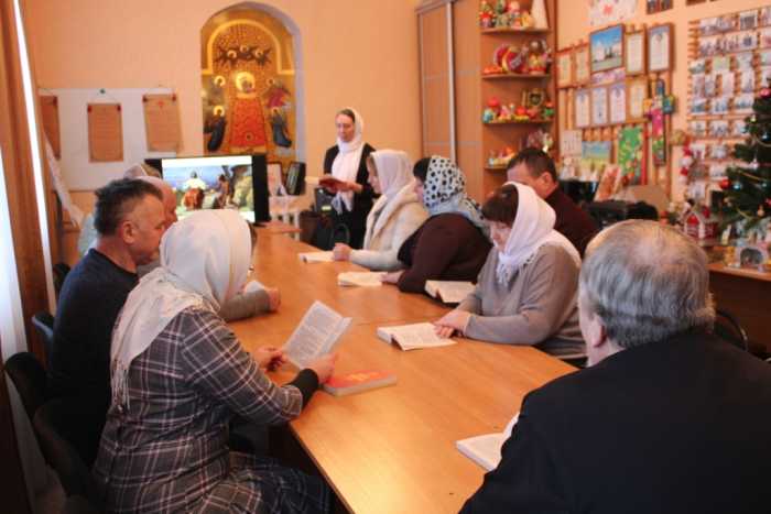 На занятии был прочитана глава четвертая Евангелия от Матфея. Члены группы вместе с помощником благочинного по религиозному образованию и катехизации Светланой Александровной Рыжаковой обсудили следующие отрывки: искушение Господа Иисуса Христа от диавола; начало Его проповеди в Галилее; призвание первых апостолов; проповедь Христова и исцеление болящих. Присутствующие обменивались своим пониманием Слова Божия и обращались к святоотеческому наследию. Непонятные моменты Евангельского текста разъяснял священнослужитель.