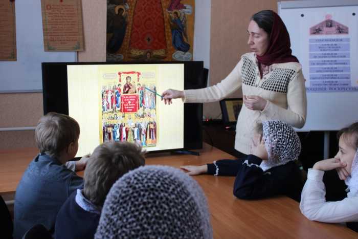 Продолжила занятие с юными христианами директор воскресной школы Светлана Александровна Рыжакова. Ребята вместе с преподавателем вспомнили основные Недели Великого Поста, после чего преподаватель пояснила, что день Торжества Православия установлен в память о событии IX века, когда в Византии завершился долгий и болезненный период иконоборчества. Почти полтора столетия шел спор о том, можно ли изображать Христа, Божию Матерь, святых и молиться перед их образами. За почитание икон людей преследовали, ссылали, лишали сана, убивали. В 843 году состоялся церковный собор в Константинополе, который осудил иконоборческое учение и восстановил почитание святых икон. По инициативе царицы Феодоры было установлено особое церковное празднование – в первое воскресенье Великого поста. И назвали его – Торжество Православия.