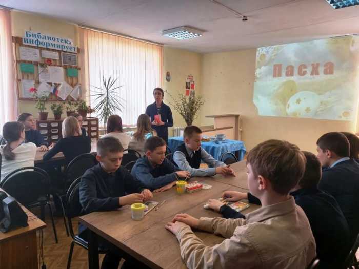 Ребята  посмотрели яркую электронную  презентацию «Пасха», в которой было рассказано о воскресении Иисуса Христа. Библиотекарь читального зала Алексей Нахаев рассказал о традициях празднования Пасхи и о символике украшения пасхальных яиц. Ученики узнали много нового о том, как издавна на Руси отмечали Светлое Христово Воскресение.