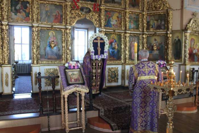 На вечернем богослужении, украшенный цветами Крест, блистающий в свете церковных светильников и свечей, был изнесен из Святая Святых, из земного неба, из алтаря Господня и возложен в центр храма для поклонения верующих.