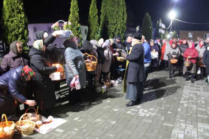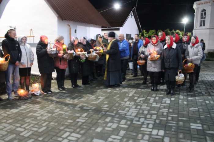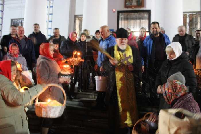 Ночное богослужение завершилось традиционным освящением пасхальных приношений верующих. Батюшка щедро окропил святой водой куличи и пасхальную снедь. И ликовали в сию светозарную ночь сердца верующих, и во все уголки Земли разносилась радость Воскресния Христова, возвещающая спасение роду человеческому.
